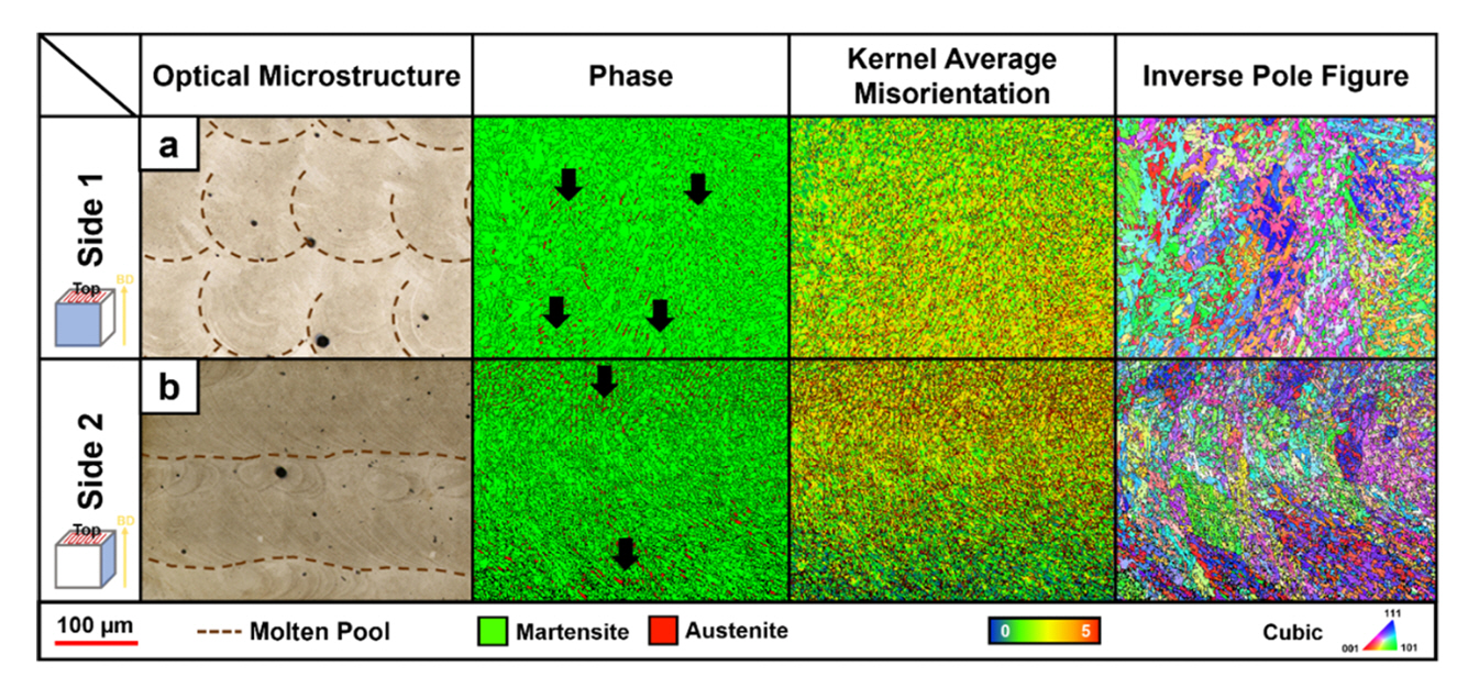 ๊ทธ๋ฆผ 3์ 0ยฐ ์ํํธ ๋ด ์ ์ธก๋ฉด์์์ ๊ดํํ๋ฏธ๊ฒฝ ๋ฐ EBSD ๋ถ์ ๊ฒฐ๊ณผ๋ฅผ ๋ณด์ด๊ณ ์๋ค. 0ยฐ ์ํํธ์์๋ ๋ ์ด์ ์ค์บ ์ค ํ์ ์ด ๋ฐ์ํ์ง ์๊ธฐ ๋๋ฌธ์