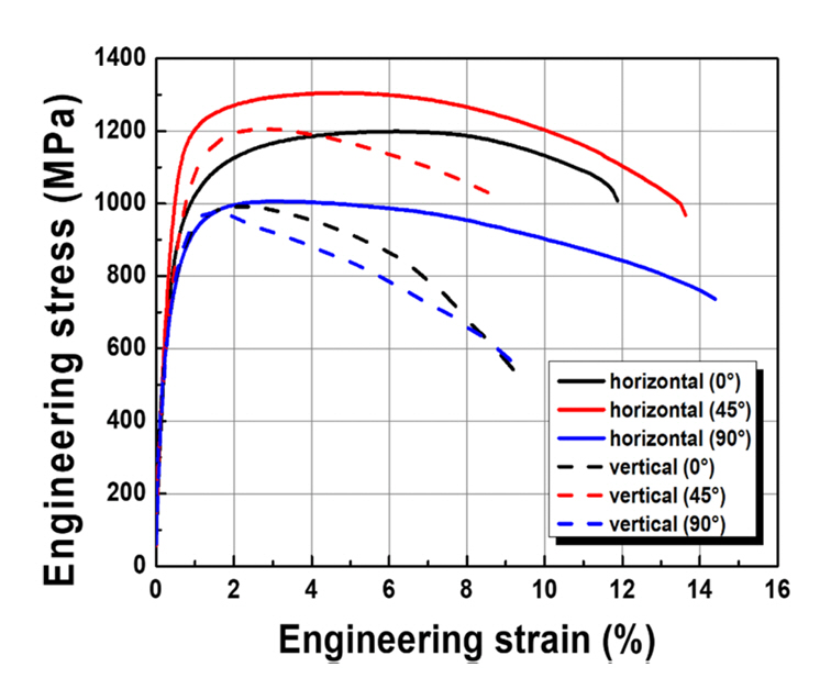 Representative engineering stress-strain curves of the DED-processed 18Ni300 maraging