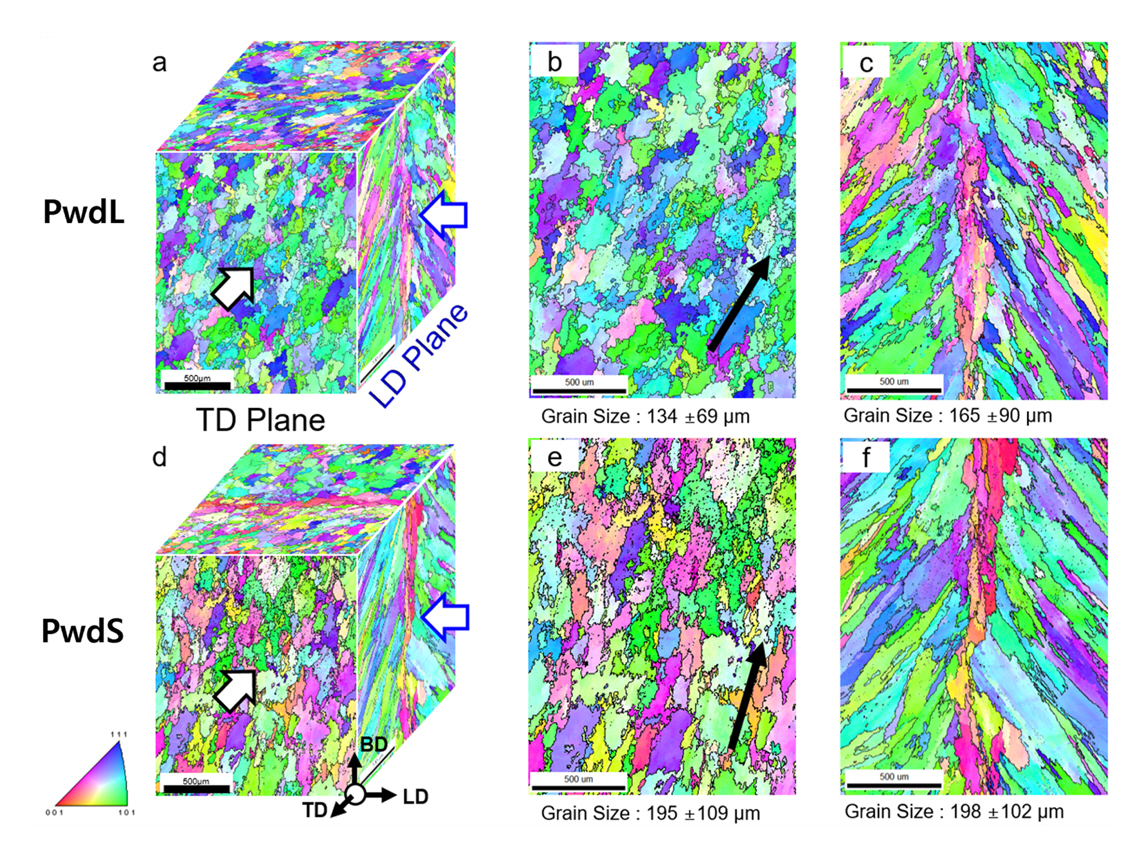 PLD가 다른 두 공정 조건, PwdL과 PwdS를 통해 제조한 적층체의 각 면을 나타낸 광학현미경 이미지를 그림 8에, SEM EBSD 관찰 결과를 그림 9에 제시하였다. 그림 8에서는 PLD에 따른 Multi-layer 적층체에서 Melt-pool 크기 변화를 확인할 수 있으며, 일부 MPB를 노란색 선으로 나타내었다. 앞선