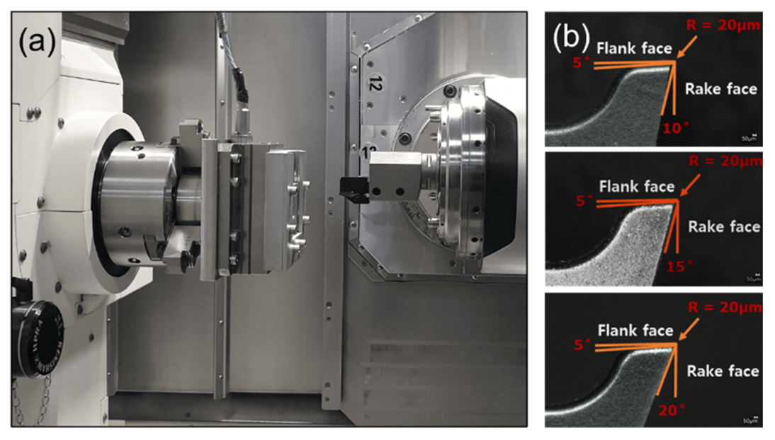 또한 최적 가공 조건을 확보하기 위하여 공구 각도(rake angle), 가공 속도, 가공 깊이를 변수로 가공 시험을 수행하였다. 그림 1 (b)에서 제시한 것과 같이 공구 각도는 10°~20°, 가공 속도는 5 mm/s ~ 10 mm/s, 가공 깊이는 0.02~0.04 mm 범위로 변경하였으며