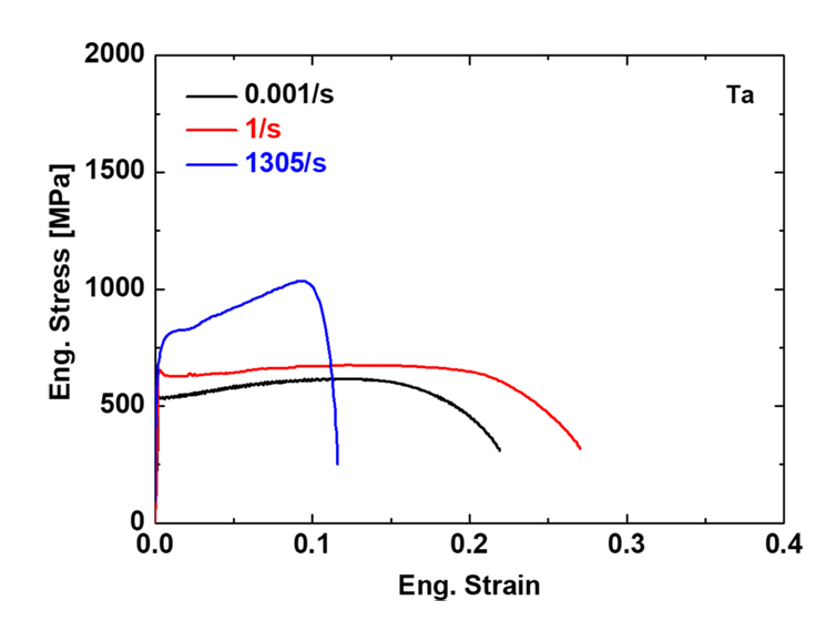 그림 10에서는 탄탈륨 합금의 상온 기계적 특성을 변형률 속도에 따라서 평가한 결과를 나타냈다. 0.001/s 속도 조건에서 항복강도는 약 500 MPa,