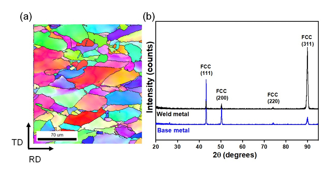 Figure 2a shows an inverse pole figure (IPF) map of the base metal measured by EBSD.