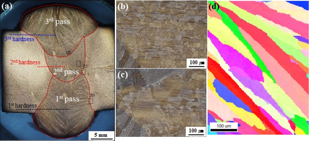 Figures 4b shows the 1st pass CGHAZ. Figure 4c shows the CGHAZ near the crossing boundary between the 1st and 2nd passes, where