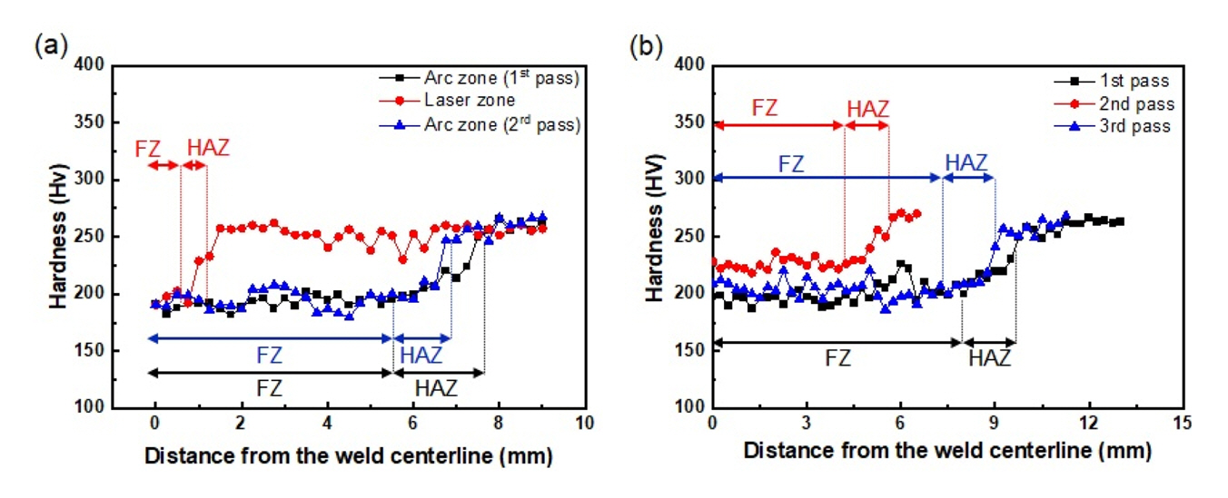 Figure 5 shows the hardness distribution of the LAHW and SAW specimens.
