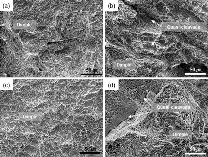 (110 K), all specimens primarily exhibit dimple fractures with some quasi-cleavage