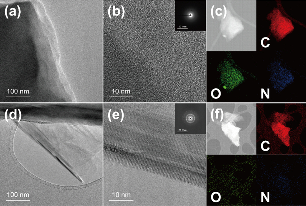 수 있었다[16]. 이들의 HRTEM 이미지와 SAED 패턴은 그림 3(b)와 (e)에 제시되었다. 그림 3(b)에서 제시된 HC는 나노미터 크기의 2~3개의 그래핀 적층을 가지는 탄소 층이 무질서하게 배열 되어있는 turbostratic 미세구조로 나노 크기의
