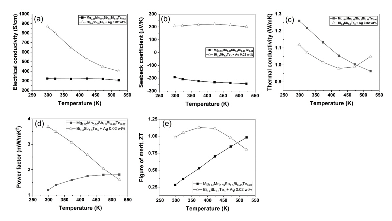 그림 3은 본 연구에서 합성된 Mg3.45Mn0.05Sb1.5Bi0.48Te0.02와 Bi0.4Sb1.6Te3 소재의 열전물성을 298-523 K 구간에서 비교하여 표시한 그래프이다. 측정온도가 실온에 가까울수록 Bi0.4Sb1.6Te3의 전기전도도가 훨씬 높았고 온도상승에 따라 급격하게 감소하는 금속성 전도특성을 보여주는 반면, Mg3.45Mn0.05Sb1.5Bi0.48Te0.02는 온도의존성이 거의 관찰되지 않았다. 반면에, 제벡계수의 절대값은 측정온도 영역에서 두 소재 모두 비슷한 값을 보였다. 이에 따라 (전기전도도)