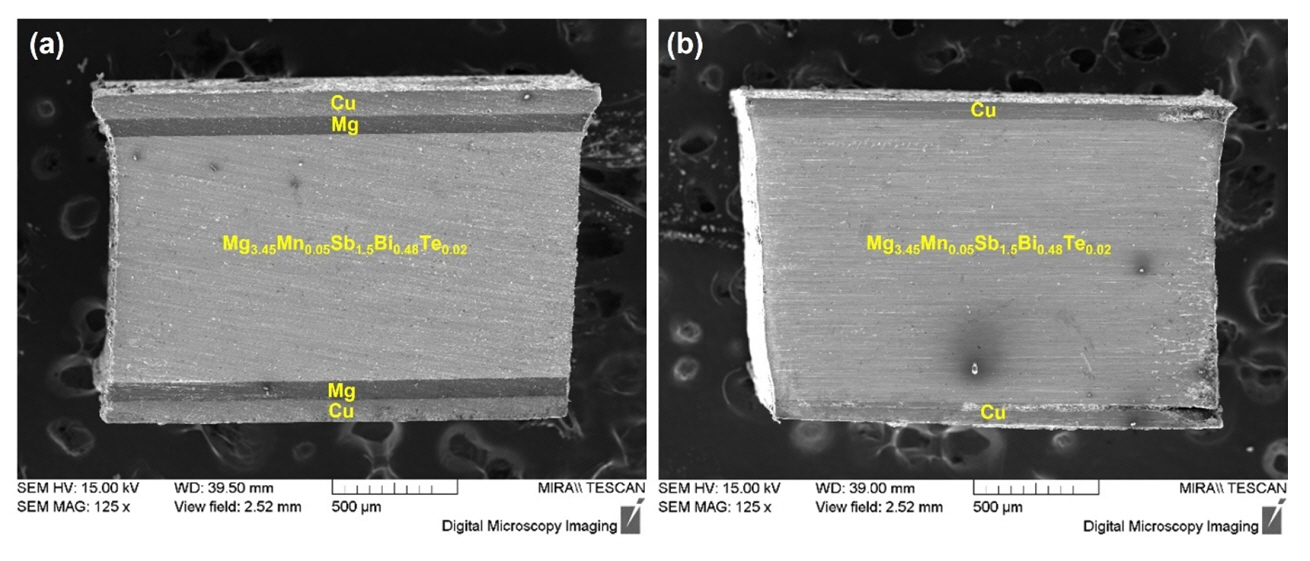 다수 완성하였다. 이와 같이 Mg/Cu 이중 금속박(double foil)이 고상접합된 Mg3.45Mn0.05Sb1.5Bi0.48Te0.02 열전레그의 단면을 전계방출 주사전자현미경 (FE-SEM, Mira-II, Tescan)으로 관찰하였으며, 원소분포를 파악하기 위하여 energy