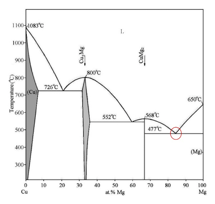 Cu-Mg phase diagram (red circle: eutectic point at 477 °C)[28,29].