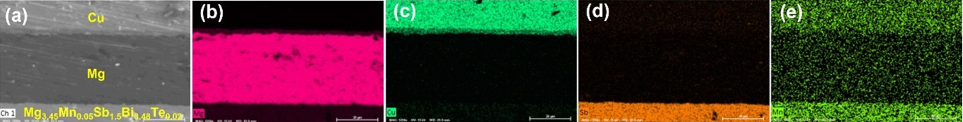 dispersive spectroscopy (EDS)로 단면을 분석하였다. 또한 Mg/Cu 접합층과 Mg3.45Mn0.05Sb1.5Bi0.48Te0.02 계면의 접촉저항 및 제벡계수 분포를 파악하기 위하여 potential-Seebeck microprobe (PSM, Panco) 분석을 실시하였다.