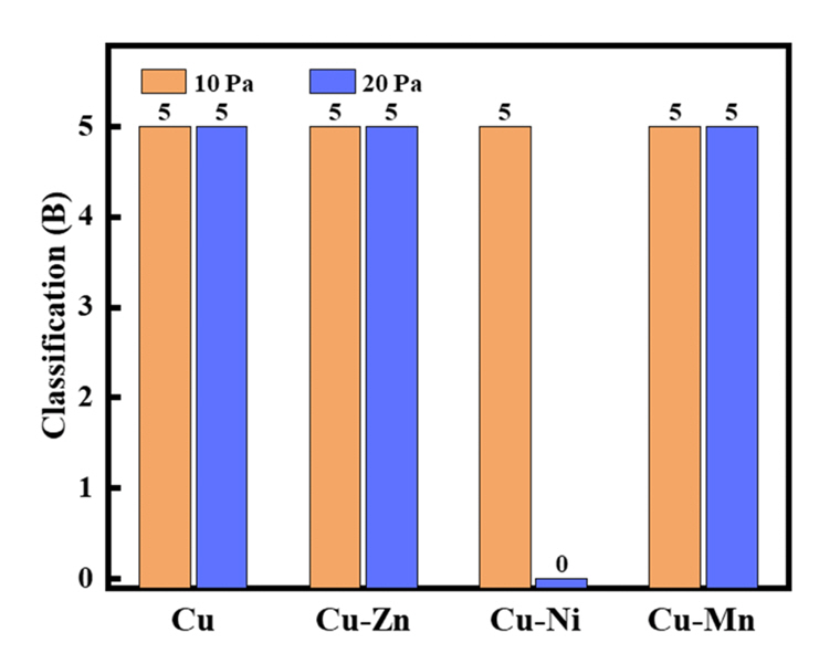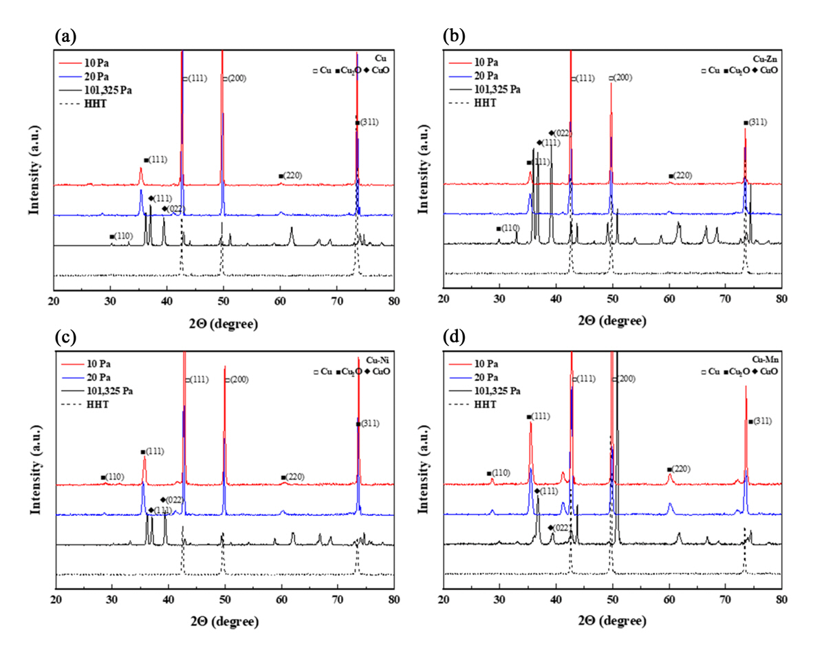 ํฉํ์ฌ ๋ํ๋๋ค. Cu, Cu-Zn ๊ทธ๋ฆฌ๊ณ Cu-Mn ํฉ๊ธ์ 10 Pa์ 20 Pa์์ ๋ฐ๋ฆฌ๊ฐ ๋ฐ์ํ์ง ์๋ ์์ ํ ์ฐํ์ธต์ด ํ์ฑ๋์์ง๋ง, Cu-Ni