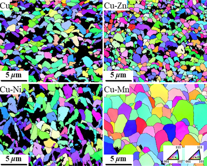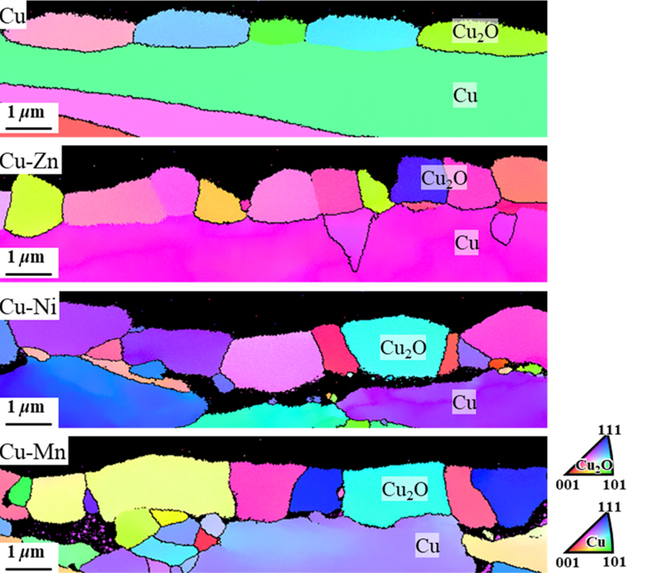 ๊ทธ๋ฆผ 5๋ 10 Pa์์ 700ยฐC๋ก 60๋ถ ๋์ ํ์ฑ๋ Cu ๋ฐ Cu-Zn, Cu-Ni, Cu-Mn ํฉ๊ธ ์ฐํ์ธต์ ํ๋ฉด์ EBSD๋ก ๋ถ์ํ ๊ฒฐ๊ณผ์ด๋ค. Cu์