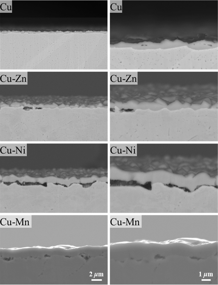 ๊ตฌ๋ฆฌ์ ๋นํด ๊ตฌ๋ฆฌ ํฉ๊ธ์์ ๋ ๋๊บผ์ด ์ฐํ์ธต์ด ํ์ฑ๋์๋ค. Cu-Zn ํฉ๊ธ์ Cu์ ์ ์ฌํ ๋๊ป์ ์ฐํ์ธต์ ํ์ฑํ์์ผ๋, Cu-Mn ๋ฐ Cu-Ni