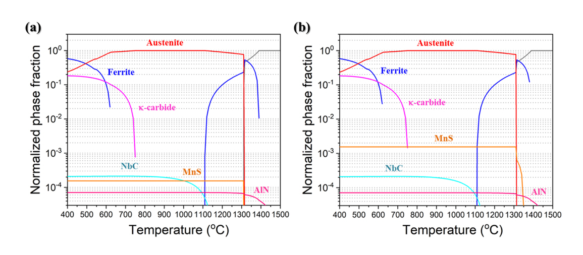 ๊ทธ๋ฆผ 1(a)์ 1(b)๋ ๊ฐ๊ฐ ์ง์ 10 ppm์ ํฌํจํ๋ MA0S์ MS50S์ Thermo-Calc. (TCFE11) ์ด์ญํ ๊ณ์ฐ ๊ฒฐ๊ณผ๋ฅผ ๋ํ๋ธ๋ค. ๊ทธ๋ฆผ 1์ ๋ํ๋ ๊ฒ๊ณผ ๊ฐ์ด 1000 ยฐC์์ ๊ท ์งํ์ด์ฒ๋ฆฌ ํ ์๋์ฒ๋ฆฌํ ํฉ๊ธ๋ค์ ๊ธฐ์ง๋ ์ค์คํ
