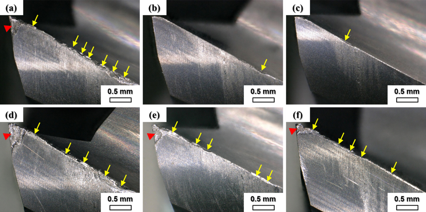 Digital micrographs of one of 4 flutes after specific milling distance: (a) 24 m in