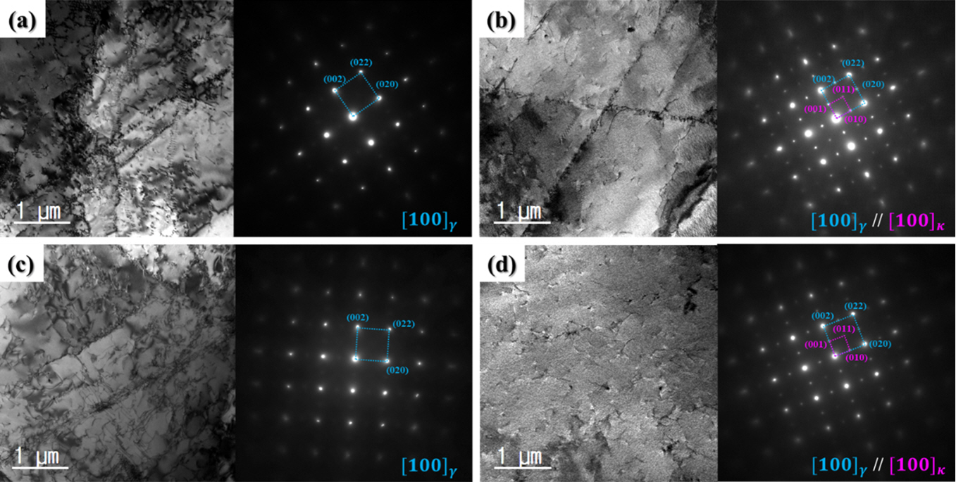๋์ดํธ๊ณ ๊ฒฝ๋์ฒ ๊ฐ์ ์ ์ ํ ์ํจ์ด์ฒ๋ฆฌ๋ฅผ ํตํด ๊ธฐ์ง ๋ด ฮบ-ํํ๋ฌผ์ ์์ถ์ํฌ ์ ์๋๋ฐ, ์ผ๋ฐ์ ์ผ๋ก (Fe, Mn)3AlC ํํ์กฐ์ฑ์ ๊ฐ๋ ฮบ-ํํ๋ฌผ์ ์ค์คํ