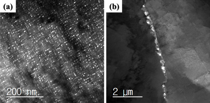 TEM micrographs of the microstructure of ฮบ-carbide observed (a) in a grain and (b)