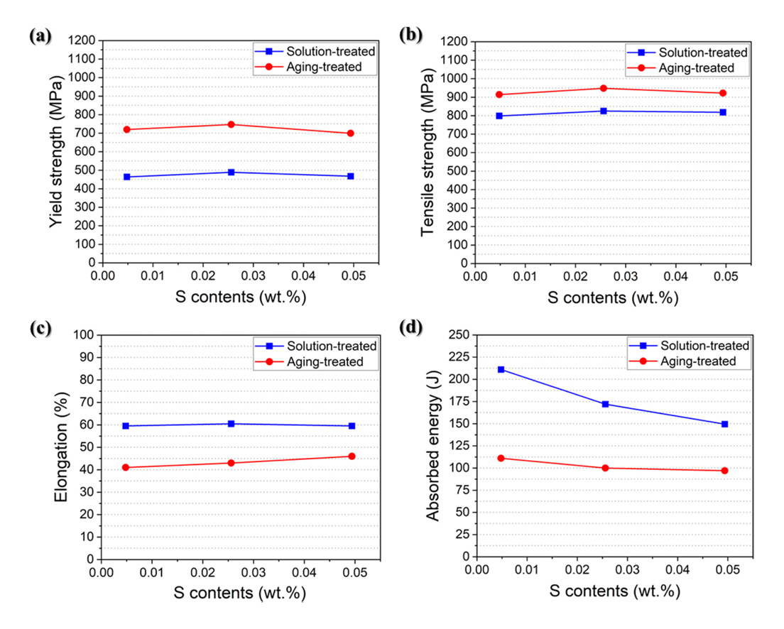 the S content of 0.0048, 0.0256, and 0.0494 wt.% added specimens, respectively. In