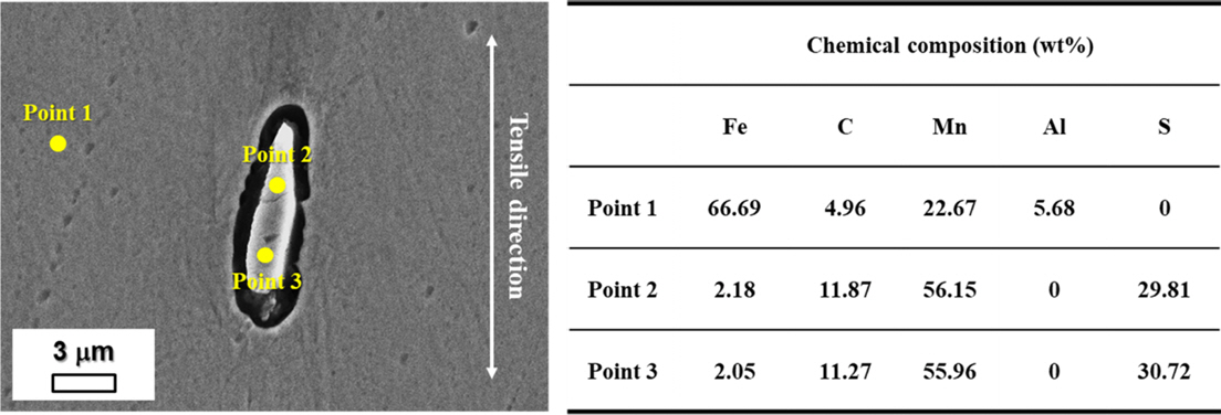 A FE-SEM micrograph with EDS point analysis of the MnS inclusion elongated by tensile