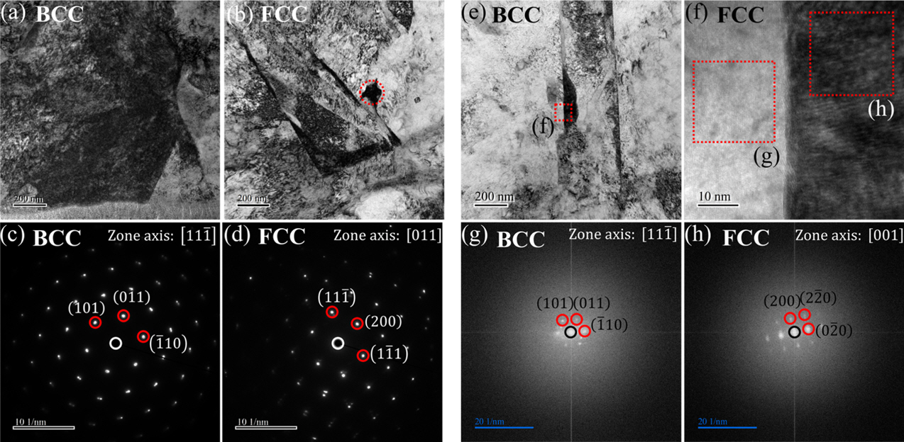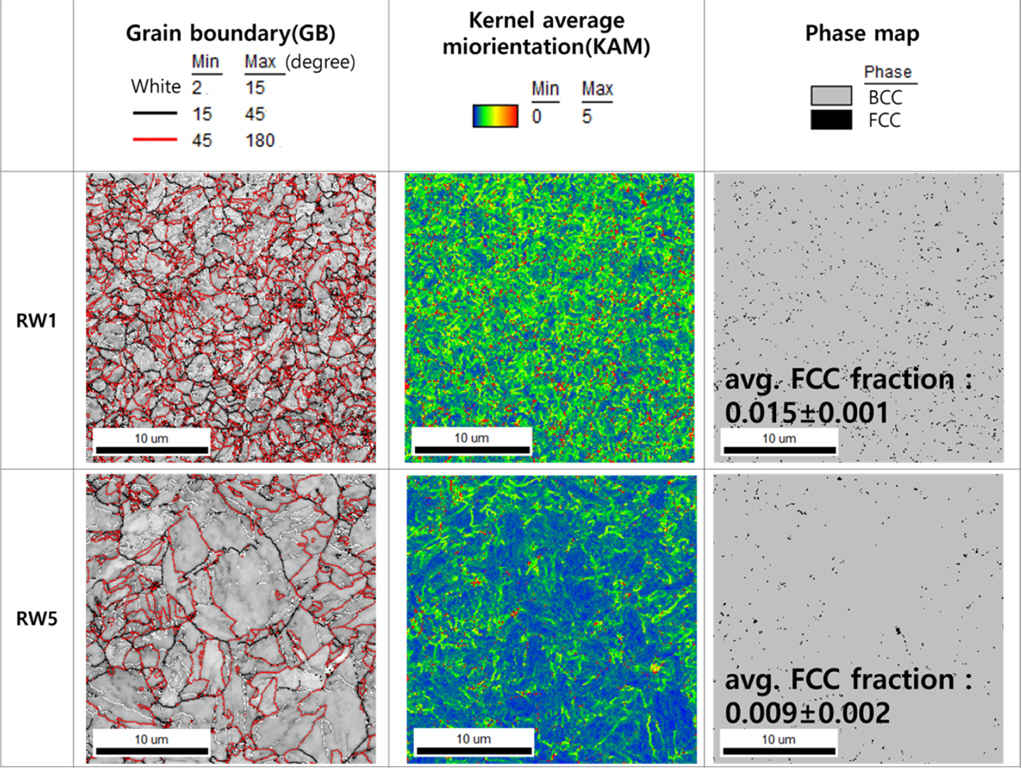 back scattered diffraction; EBSD)로 미세조직의 결정구조학적 분석을 수행하였고, 각도 70°, 가속전압 20 kV 그리고