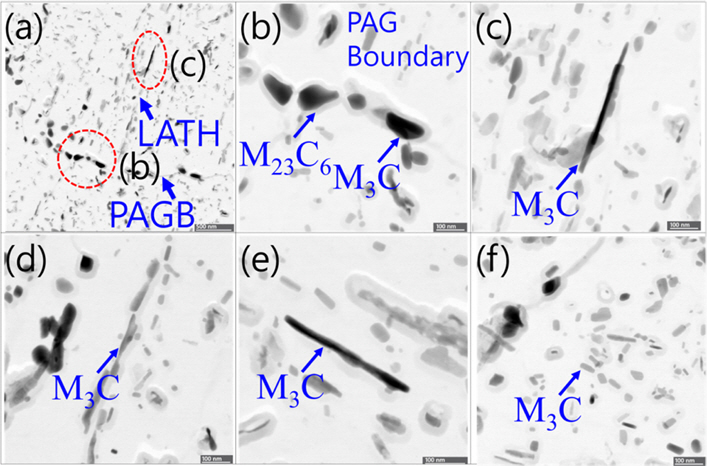 분석하였다. 석출물은 명확하게 보이는 결정립 경계를 포함하여 50,000배 배율의 이미지 18개에서 Image-Pro를 사용하여 석출물의 분포와 크기를