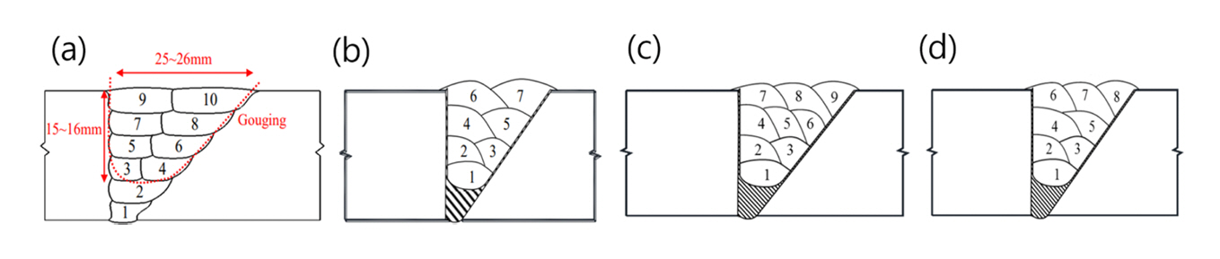 강을 접합하는 데에는 제작 환경에 따라 다양한 용접 공법이 사용되며, 특히 용접부와 HAZ의 기계적 성질과 미세조직 등에 대해 많은 선행 연구가 진행되었다[3–20]. 일반적으로 수정 용접은 결함을 제거하거나 구조물 형상 변경으로 재용접 할 경우에 적용되며, 선박용 고장력강에는 수정 용접의 횟수를 최대 세번