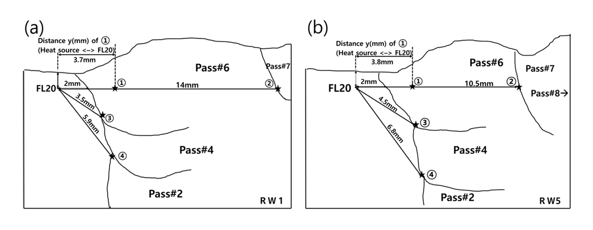 측정하였다. 위치 ①은 패스 #6이 위빙 비드를 적용하여 비드 폭 방향으로 움직이므로 열원의 위치를 FL에서 weld metal (WM) 방향으로