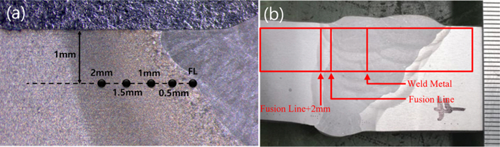 그림 4a는 HAZ 경도의 측정위치를 나타내었다. 비커스 경도는 ISO 6507–1에 따라 하중 10 kgf로 저온인성이 우수한 I 개 선측 fusion line