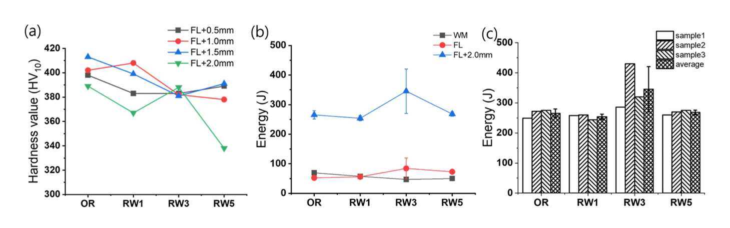 이루어졌다. 위치 ②와 ④의 온도는 AC1–AC3 온도 이하로 계산되어 NTC에 포함되지 않았다. OR에 비해서 수정 용접 횟수가 RW1에서 RW5로 증가함에 따라 AC1–AC3 온도 이상의 열영향 반복 횟수는 증가하였다.