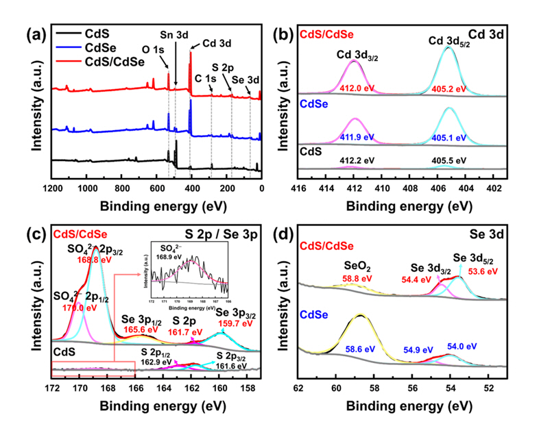 eV(SO42-), 162.9 eV(S 2p1/2), 161.6 eV(S 2p3/2)로 deconvolution 된 것을 확인할 수 있었다. SO42- 피크는 합성과정에서 사용된 물질이 전부 제거되지 않고 소량 남아있어 관측된 것으로 파악되며, S 2p1/2와 S 2p3/2 피크는 cadmium sulfide의 S 2p 피크와 동일한 것으로 보아, CdS가 잘 합성된 것으로 보인다 [40–42]. CdS/CdSe 광양극의 경우에는 S 2p 피크는 170.0 eV(SO42- 2p1/2), 168.8 eV(SO42- 2p3/2), 161.7 eV(S 2p)로 deconvolution 되었고, SO42- 피크들은 CdS 광양극과 마찬가지로 합성 과정에서 사용된 물질이 남아있어 관측된 것으로 보인다. S 2p 피크의 경우에는 CdS 입자가 CdSe에