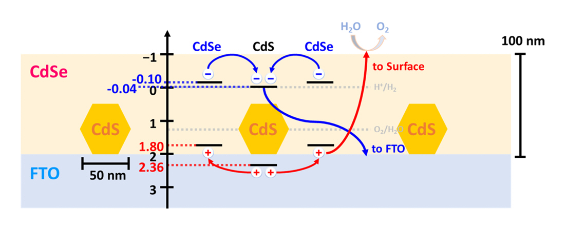 광양극을 합성하여 PEC 성능을 극대화한다. CdS와 CdSe 모두 단독으로 사용할 경우 안정성이 떨어진다는 단점을 가지지만, 각각 2.4 eV,