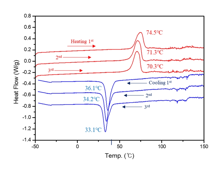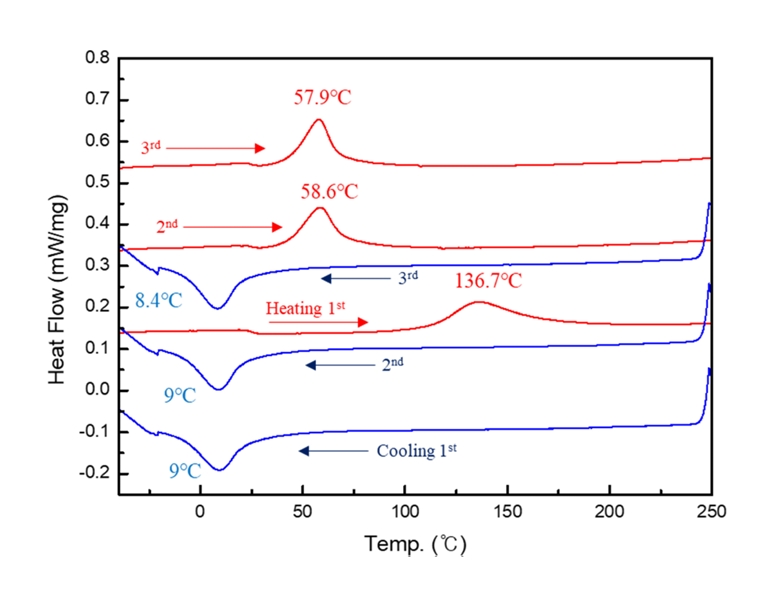 그림 4는 열처리 후 시편의 시차주사열량계 분석 결과를 보여주고 있다. 3번의 반복 측정(cyclic test)을 진행하였으며 온도 범위는 -50°C에서