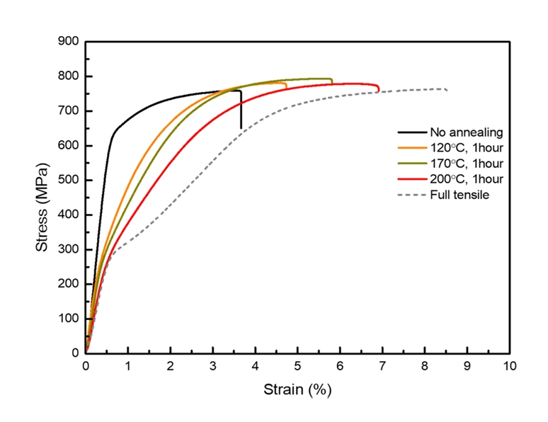 발생하였다. 반면 치유 열처리를 행한 시편의 경우 흥미롭게도 열처리 온도가 120°C에서 200°C까지 증가함에 따라 파단 변형율은 4.71%에서