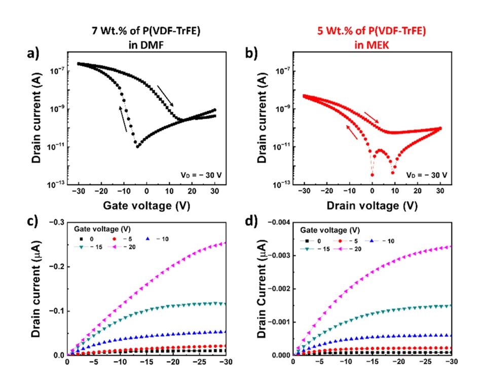 Fe-FETs were measured using P(VDF-TrFE) and P(VDF-HFP) films from both DMF and MEK
