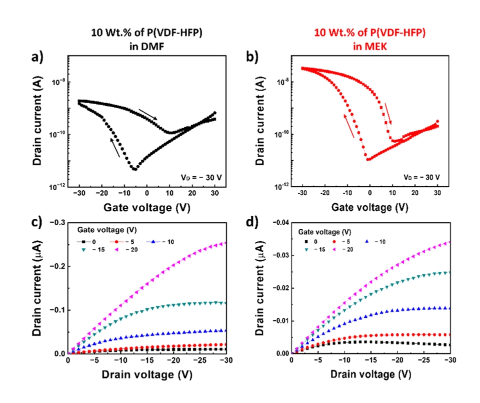 from the DMF and MEK solvents. The extracted memory window (ΔVth) and drain currents of the P(VDF-HFP) with DMF were 25.1 V and 0.025 μA and 15.0