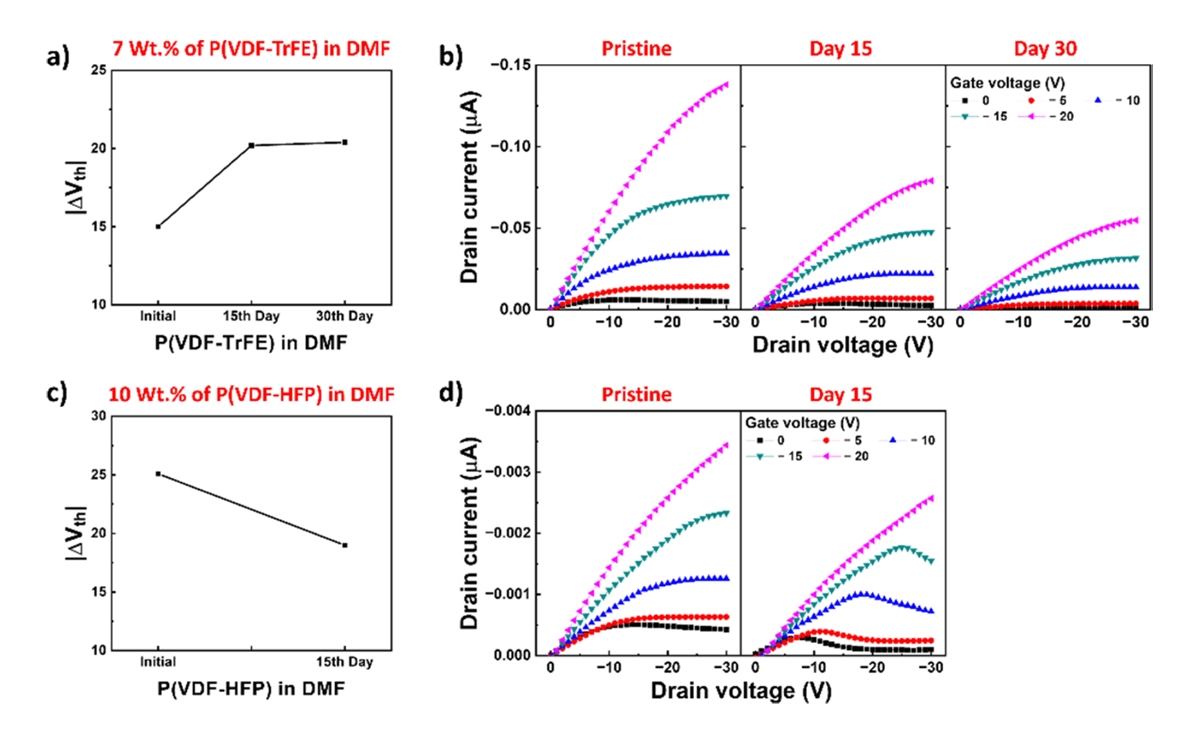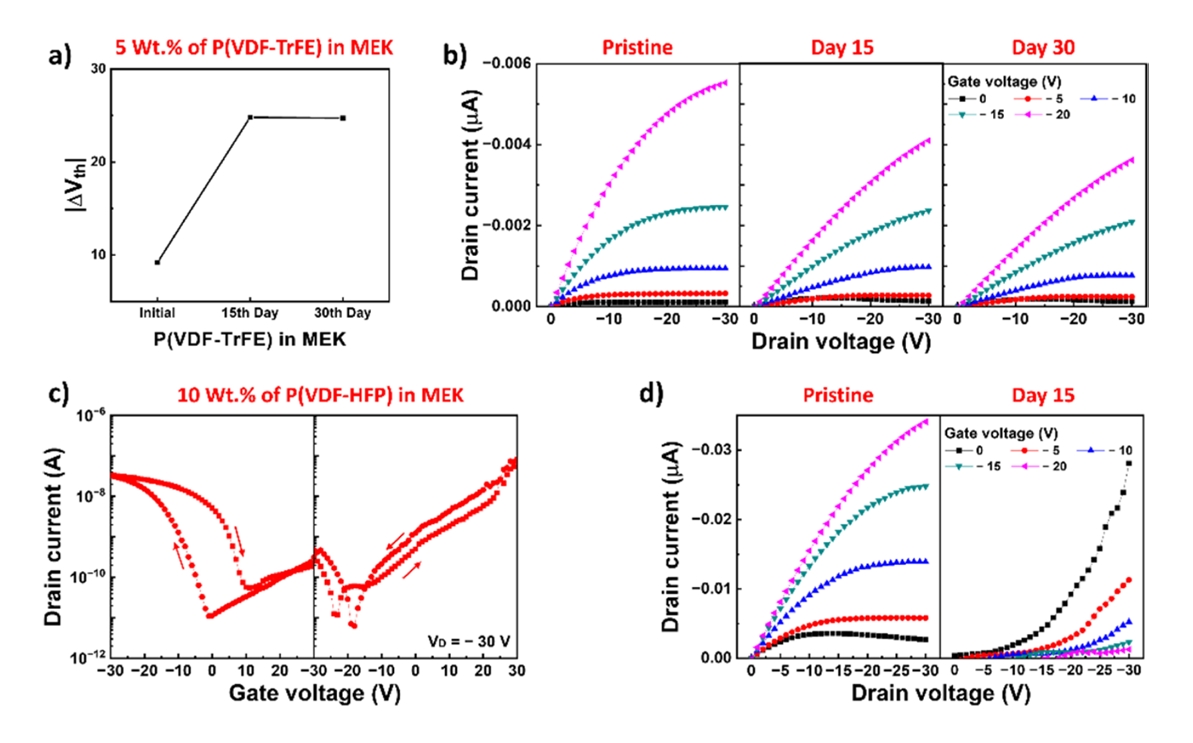 ΔVth of P(VDF-TrFE) and P(VDF-HFP) from the DMF solvent are shown in Figure 4 (a, c), and its corresponding output characteristics are depicted in Figure 5 (b, d). The initial ΔVth values of the Fe-FET with P(VDF-TrFE) and P(VDF-HFP) dielectric layers were 15.0
