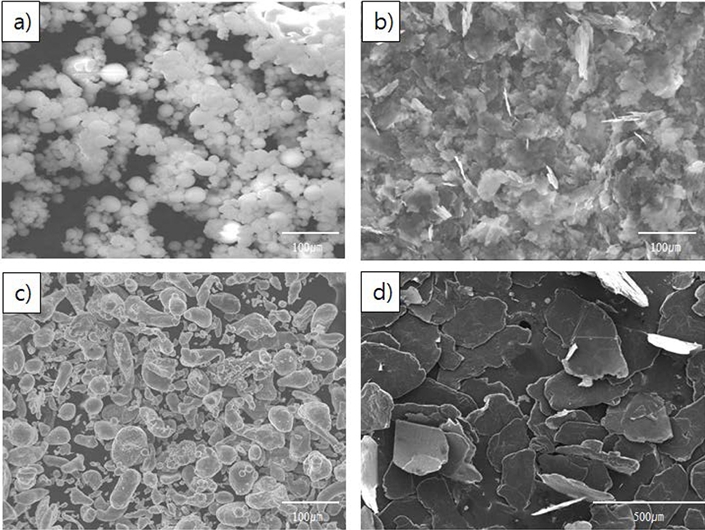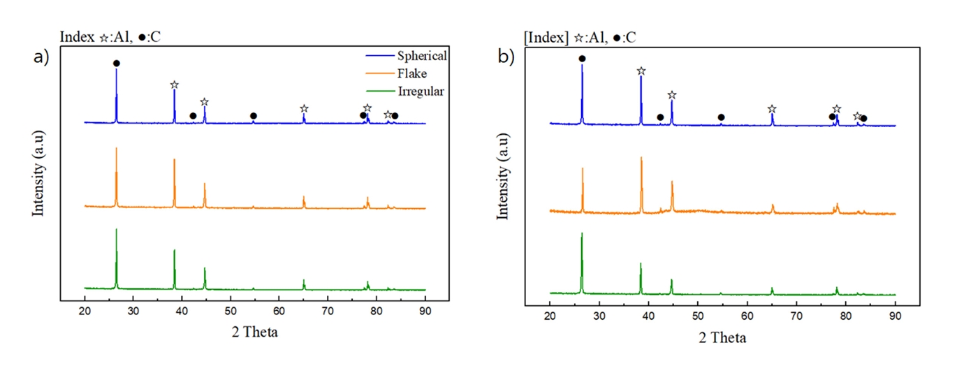 ๊ฐ ๋ถ๋ง ํํ์ Al๊ณผ Gr.๋ฅผ 5:5 vol.%๋ก ์์ดํฌ ๋ฏน์๊ธฐ์ 1์๊ฐ ๋์ 2500 rpm์ผ๋ก ํผํฉํ๋ค. ํผํฉ๋ ๋ถ๋ง์ ํ์ฐ ๋ชฐ๋(์ธ๊ฒฝ: 40