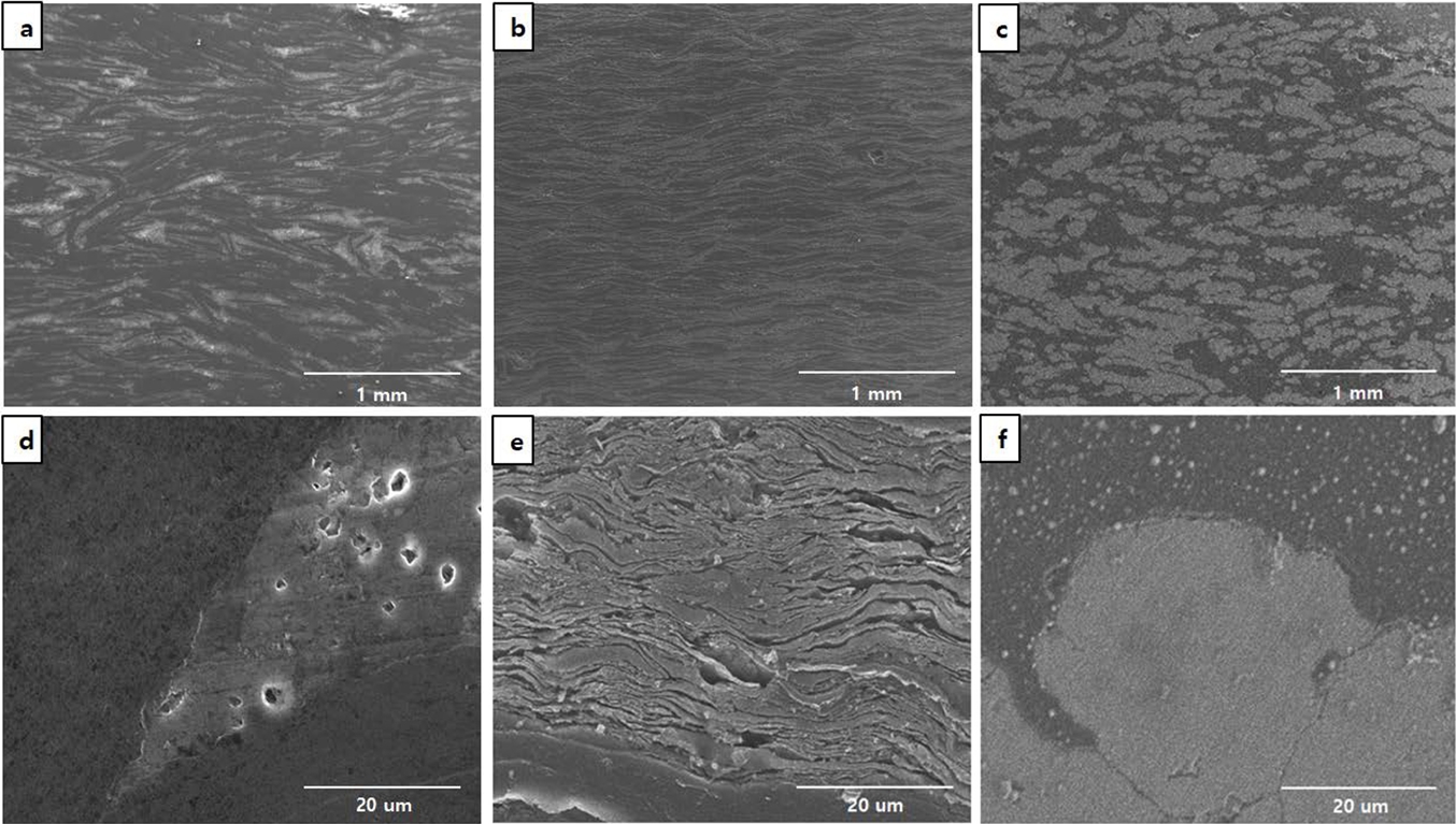 ๊ทธ๋ฆผ 4๋ ์ฃผ์ฌ์ ์ํ๋ฏธ๊ฒฝ์ ํตํด ๋ถ๋ง ํ์์ ๋ฐ๋ฅธ Al-Gr. ์๊ฒฐ์ฒด์ ์ด๋ฏธ์ง๋ฅผ ๋ณด์ฌ์ค๋ค. ๊ทธ๋ฆผ 4(a-c)๋ ์ ๋ฐฐ์จ์์์ ์ด๋ฏธ์ง ๋ถ์ ๊ฒฐ๊ณผ๋ก, (a-c)๋ ๊ฐ๊ฐ ๊ตฌํ, ํ์ํ, ๊ทธ๋ฆฌ๊ณ ๋ถ๊ท์น์ด๋ค. ๊ทธ๋ฆผ 4a์ Gr.๋ ๋ฌด์ง์ํ ๋ฐฉํฅ์ผ๋ก ์ฑ์ฅํ ๋ฐ๋ฉด, ๊ทธ๋ฆผ 4b์ Gr.๋ ์ผ์ ํ๊ฒ x์ถ ๋ฐฉํฅ์ผ๋ก ์ฑ์ฅํ์๋ค. ์ด์๋ ๋ฌ๋ฆฌ, ๋ถ๊ท์น ํํ์Gr.๋ ์ด์ด์ ธ ์๋ ํํ๋ก ์ฑ์ฅํ์๋ค. ์ด๋ฌํ ์ฐจ์ด๋ Al ๋ถ๋ง์ ํ์์