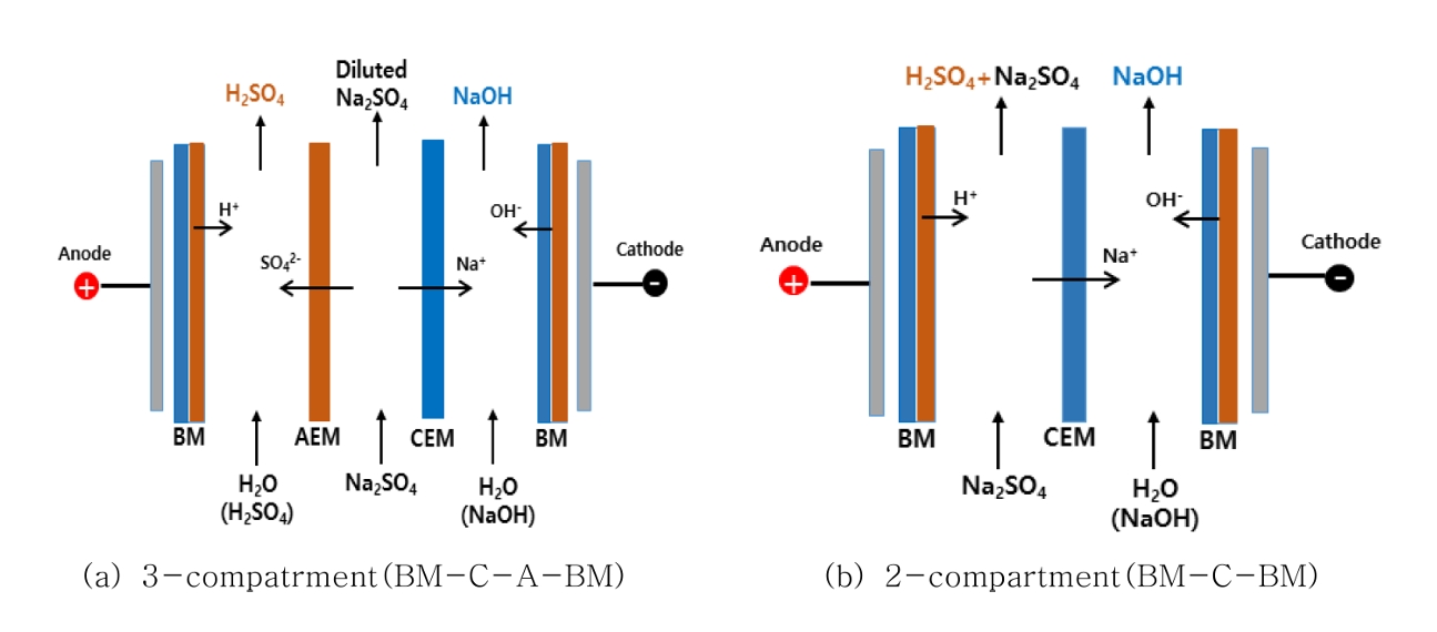 2액실(염기 회수실 혹은 산 회수실, 원료 용액실)방법으로 구분된다[9-12]. 3액실 구조(BM-C-A-BM)는 바이폴라막 사이에 양이온 교환막과 음이온 교환막이 배치되어있는 구조로 황산나트륨을 분해하여 고순도 황산과 가성소다를