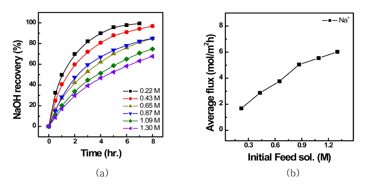 회수율 및 Na+의 플럭스가 감소하기 때문에 염기의 회수 농도를 높이기 위해 초기 염기의 농도를 조절하는 것은 바람직하지 않다고 판단된다.