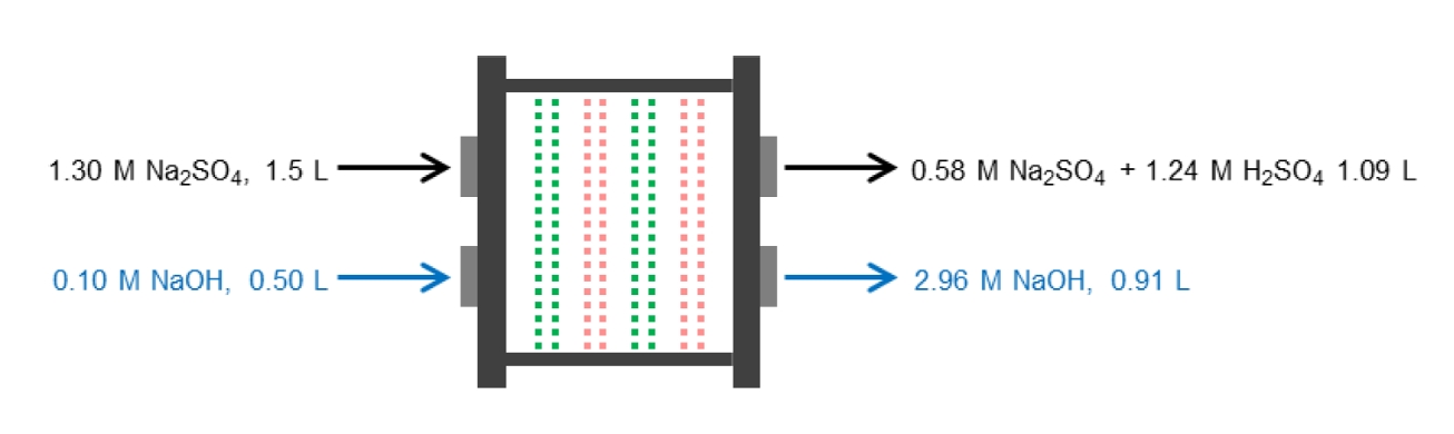 농도는 2.96 M NaOH이었고, 원료 용액실에는 1.24 M H2SO4가 생성되어 Na2SO4와 혼합된 복합 염으로 회수되었다. 이 경우 1 kg Na2SO4 처리시 에너지 소비량은 2.21 kWh이었다.