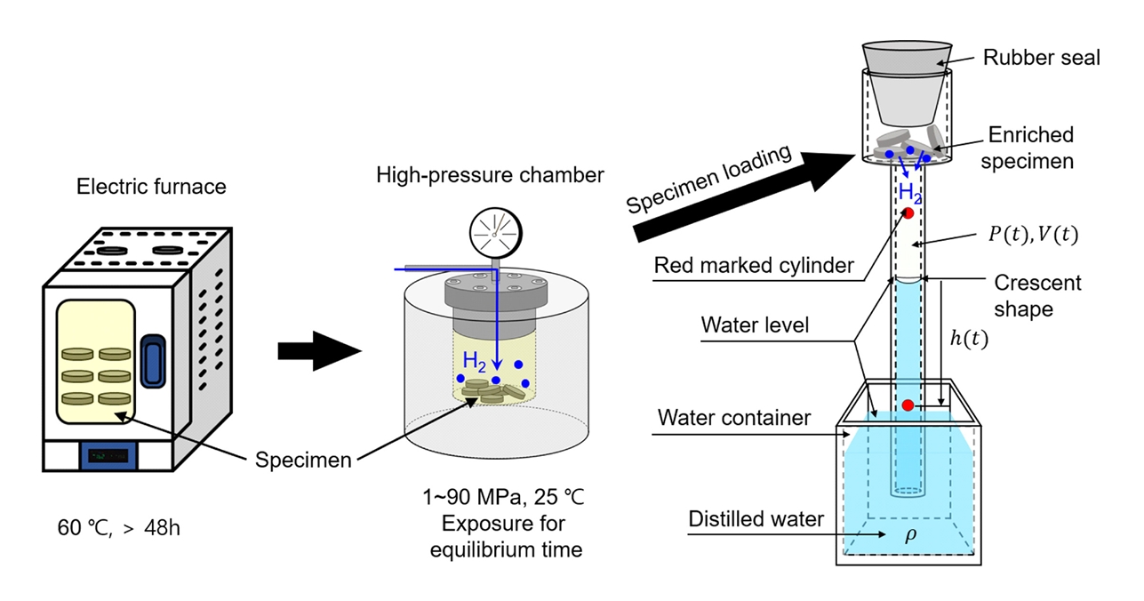 시편 외부 표면에서 서서히 방출된다. 이때 수소 기체 분자는 불수용성므로, 그림 1의 오른편에 실린더 윗부분의 비어있는 공기 공간에 고분자 시편을 삽입한 후 실리콘 고분자로 밀봉하면 시료로부터 방출하는 수소 기체가 실린더 내부의