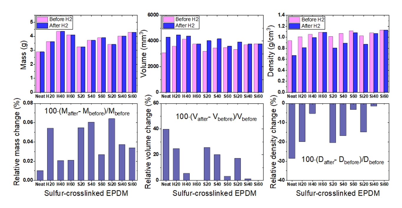및 확산도의 연관성 연구를 위해 90 MPa 압력에서 수소를 충전하기 전과 충전후 10종 시편의 질량, 부피 및 밀도 변화를 충전제의 함량에 따라