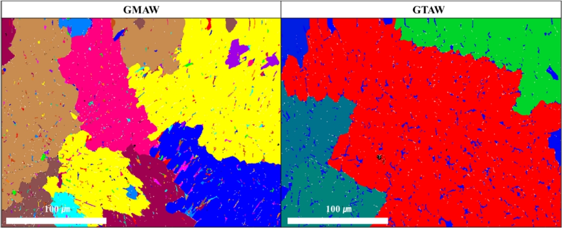 그림 11은 입열량의 차이에 따른 용접부의 상을 비교하기 위한 EBSD 이미지이다. GMAW 용접부의 결정립 크기는 평균 95.756 μm가 나타났으며 GTAW