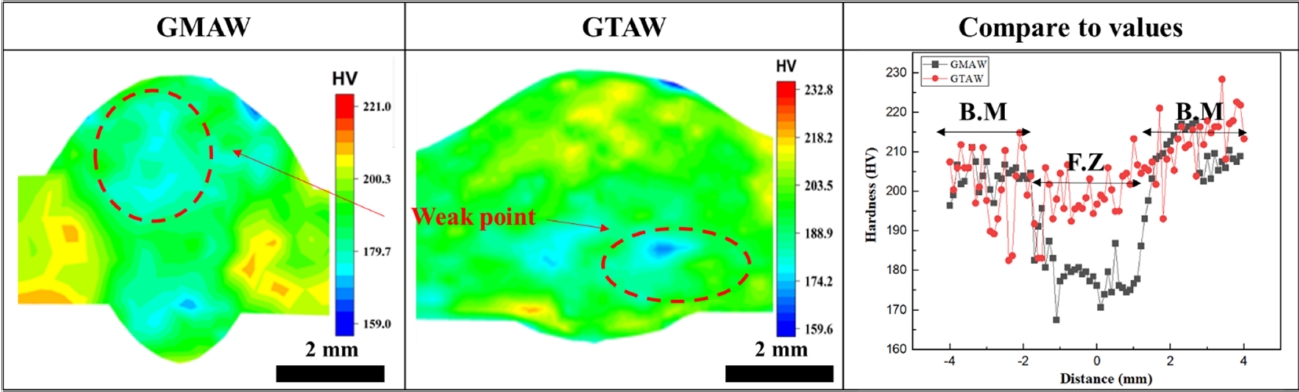 그림 15는 경도 맵핑을 통해 용접부의 경도를 비교한 이미지이다. 두 공법으로 제작한 시편 모두에서 용접부의 경도는 모재에 비해 낮게 나타났다. 이는 용접부에서