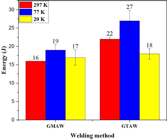 비해 상대적으로 높은 충격 인성을 나타내었다. 또한 20 K 조건에서 실시한 충격 시험 결과, GMAW 및 GTAW 공정에 따라 각각 17 J 및