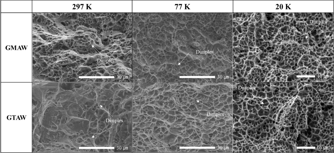 용접부의 파단면에서는 모든 온도 조건에서 연성 파괴의 특징인 딤플(dimple) 형태가 관찰되었다. 특히, 극저온(20 K) 환경에서도 벽개 파괴(cleavage)