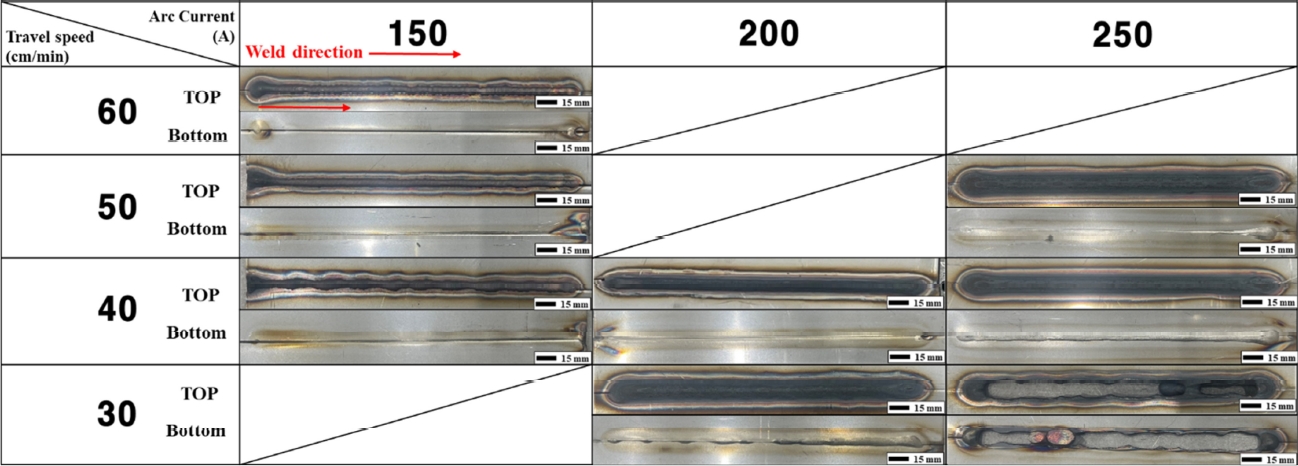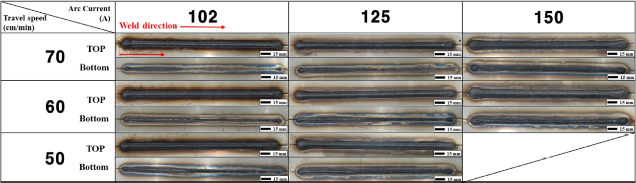 조건에서는 전면 비드가 다른 조건과 유사하게 균일한 형상을 보였으나, 후면 비드는 일관되게 형성되지 못하였다. 125 A–70 cm/min 조건에서는