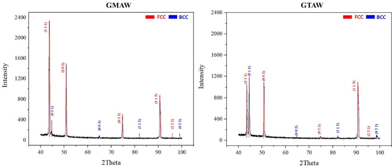 그림 9는 아크 용접 공법 간 용접부의 FCC 및 BCC면 차이를 확인하기 위해 XRD 분석을 진행한 이미지이다. GMAW 공법에 의해 형성된 용접부는 FCC(111)