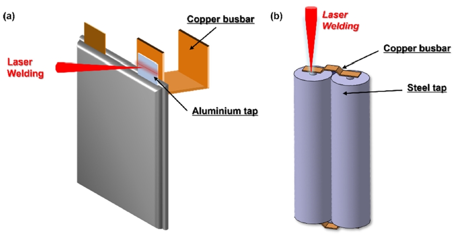 모델 S 85kW는 7104개, Roadster는 6831개의 원통형 셀로 구성된다[1]. 배터리 셀 형태에 따라 원통형뿐만 아니라 파우치형 배터리도 존재하며, 그림 1과 같이 리튬 이온 배터리의 종류에 따라 파우치 셀(Cu-Al) 및 원통형 셀(Cu-Fe)의 이종 소재 용접 기술이 적용된다. 상기 이종 용접에 대한